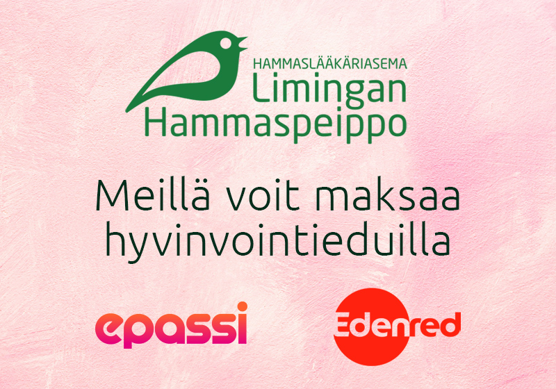 Meillä Hammaspeipossa on käytössä maksutapoina Edenred ja Epassi. Voit hyödyntää hyvinvointietua kaikkiin hammaslääkärin ja suuhygienistin palveluihin lukuunottamatta esteettisiä hoitoja.